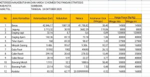 “Sementara untuk komoditi lainnya seperti daging sapi, daging ayam, telur ayam, gula pasir, cabe rawit, cabe besar, bawang putih dan kedelai tersedia mulai dari 23 ton hingga ratusan ton dan bertahan selama seminggu hingga 26 Minggu,” ungkap Kepala Dinas Ketahanan Pangan Kabupaten Sumbawa, Ahmad Yani melalui Sekretaris Dinas Ketahanan Pangan Kabupaten Sumbawa, syaihuddin, saat ditemui media ink di ruang kerjanya pada Kamis, (30/10).