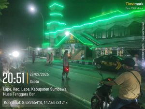 Sumbawa, SelarasNews.id – Guna memberikan rasa aman dan nyaman bagi umat Muslim yang menjalankan ibadah di bulan suci Ramadan 1447 H, jajaran Polsek Lape Polres Sumbawa melaksanakan pengamanan intensif ibadah Shalat Isya dan Shalat Tarawih. Kegiatan ini dipusatkan di Masjid Besar Darussalam, Desa Dete, Kecamatan Lape, Sabtu (28/02) malam.